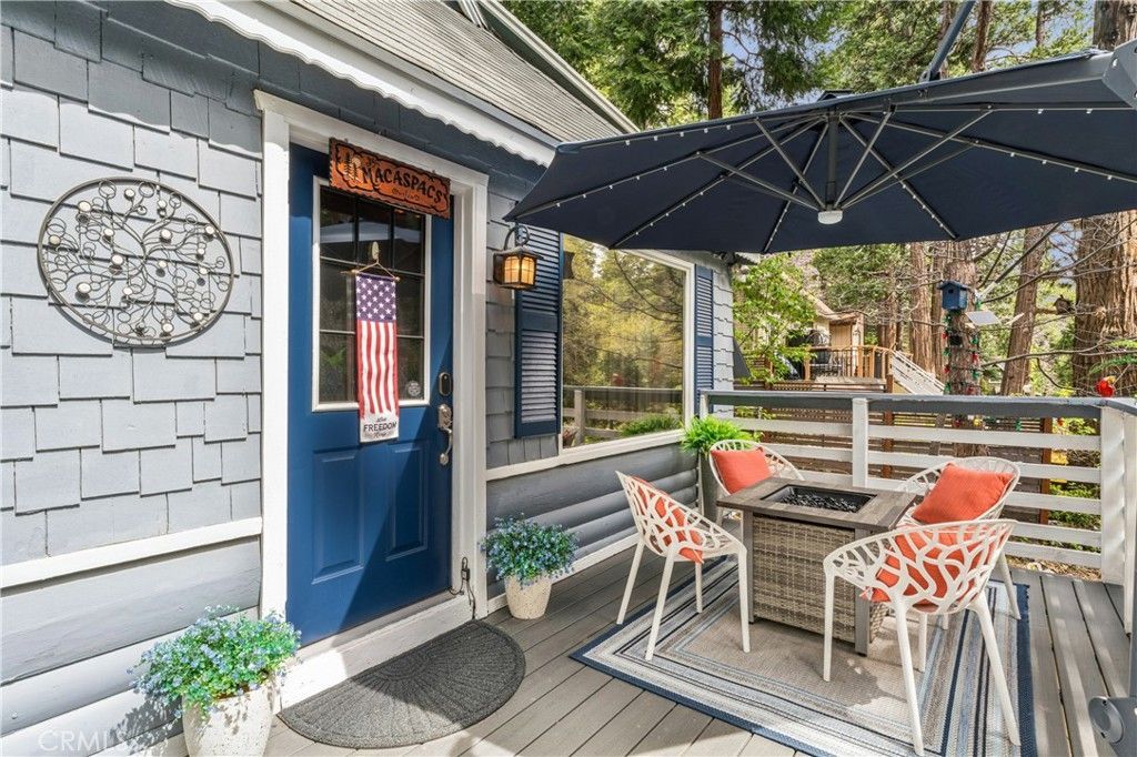 1923 Blue Jay vintage cabin backing to protected forest. Full of original charm and thoughtfully updated over the years, this 3-bedroom mountain retreat sits on a quarter-acre lot in a prime location less than a quarter mile from Blue Jay shops and restaurants and about half a mile to the lake. Features include an updated kitchen with Bosch dishwasher, updated full bath with original tub, updated plumbing and electrical, refurbished stone fireplace, and original refinished hardwood floors. The expanded downstairs bedroom accommodates a triple bunk bed plus a single bed, with two additional bedrooms upstairs. Recent improvements include interior and exterior paint, newer blinds, updated light fixtures selected to match the cabins vintage character, added corner cabinets, newer Trex front patio, umbrella solar lights, and firepit. Detached original deep single-car garage with stone walls provides great storage. A newer guest house on the side plateau offers space for up to 3 guests or flexible use as a storage structure. Set among mature cedar and pine trees, with access to nearby hiking trails and street-side parking for 3?4 cars, this furnished mountain getaway captures the charm of early Lake Arrowhead living.